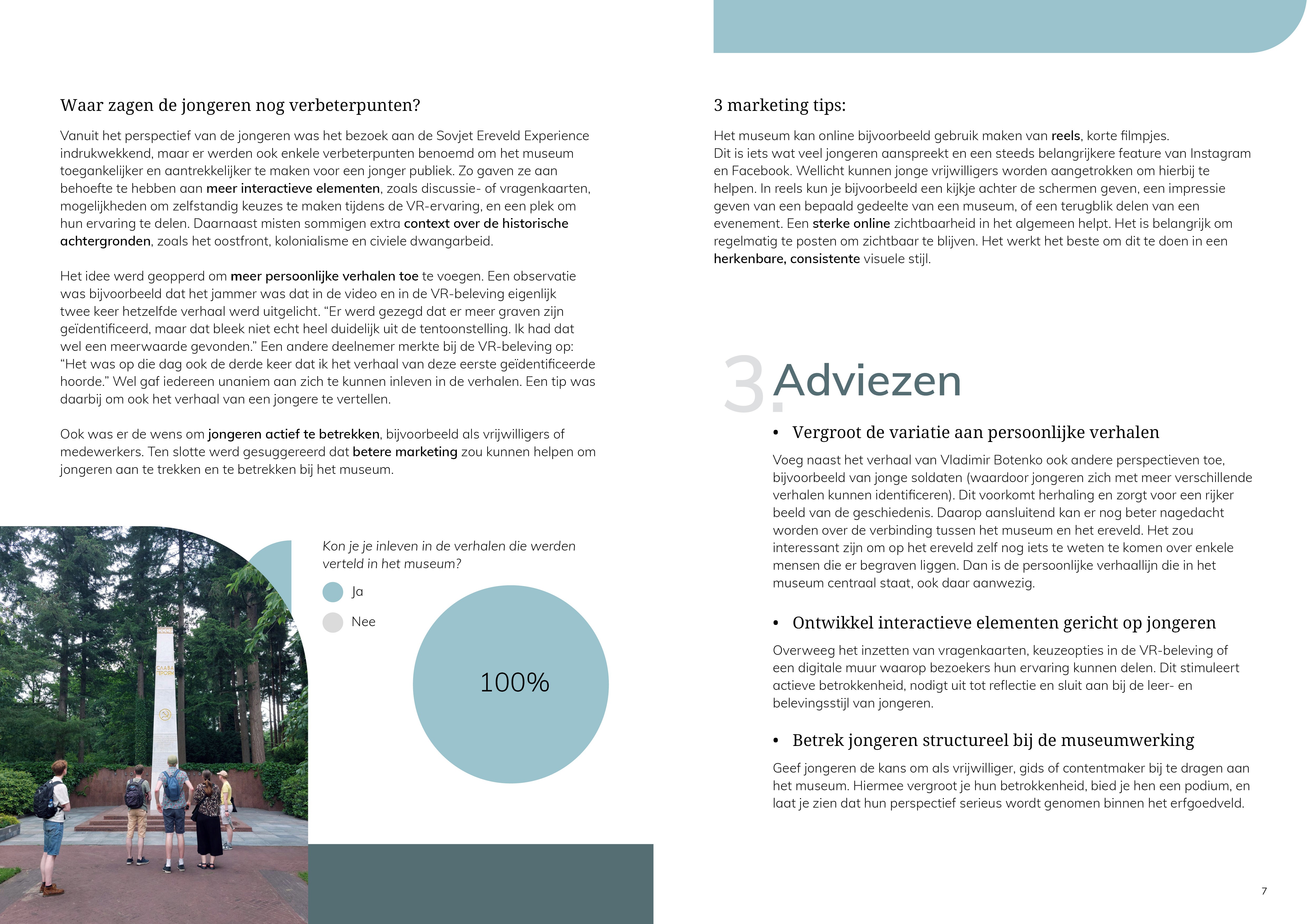 De aanbevelingen zijn door de community verwerkt in een kort en bondig verslag, dat vervolgens opgeleverd is aan het bestuur en de vrijwilligers van Stichting Sovjet Ereveld. Jongeren zijn heel positief over het nieuwe museum en zouden het zeker aanbevelen aan familie en vrienden. Groot pluspunt is dat zij zich goed konden inleven in de verhalen en geschiedenis door het gebruik van video's, projecties, VR en vooral de individuele verhalen van mensen die hieraan zijn gekoppeld.